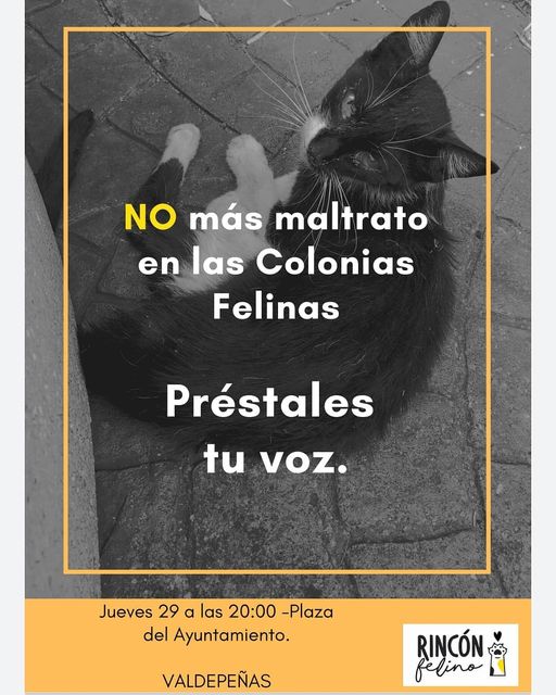 Rincon Felino ha organizado una manifestación para este jueves a las 20:00 horas en la Plaza de España de Valdepeñas con el fin de alzar la voz contra el maltrato en las colonias felinas.