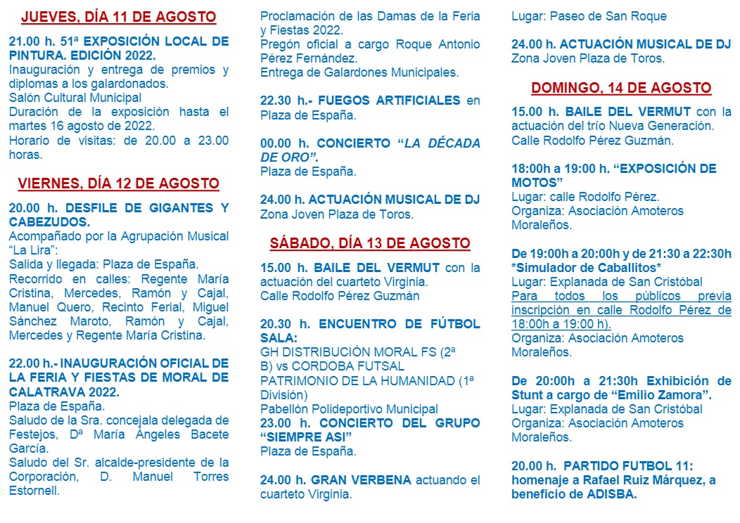 Moral prepara para los próximos días una serie de eventos entre los que destacan los musicales. Con un presupuesto de 120.000 euros así se presentan la Feria y Fiestas moraleñas desde hoy al 16 de agosto:
