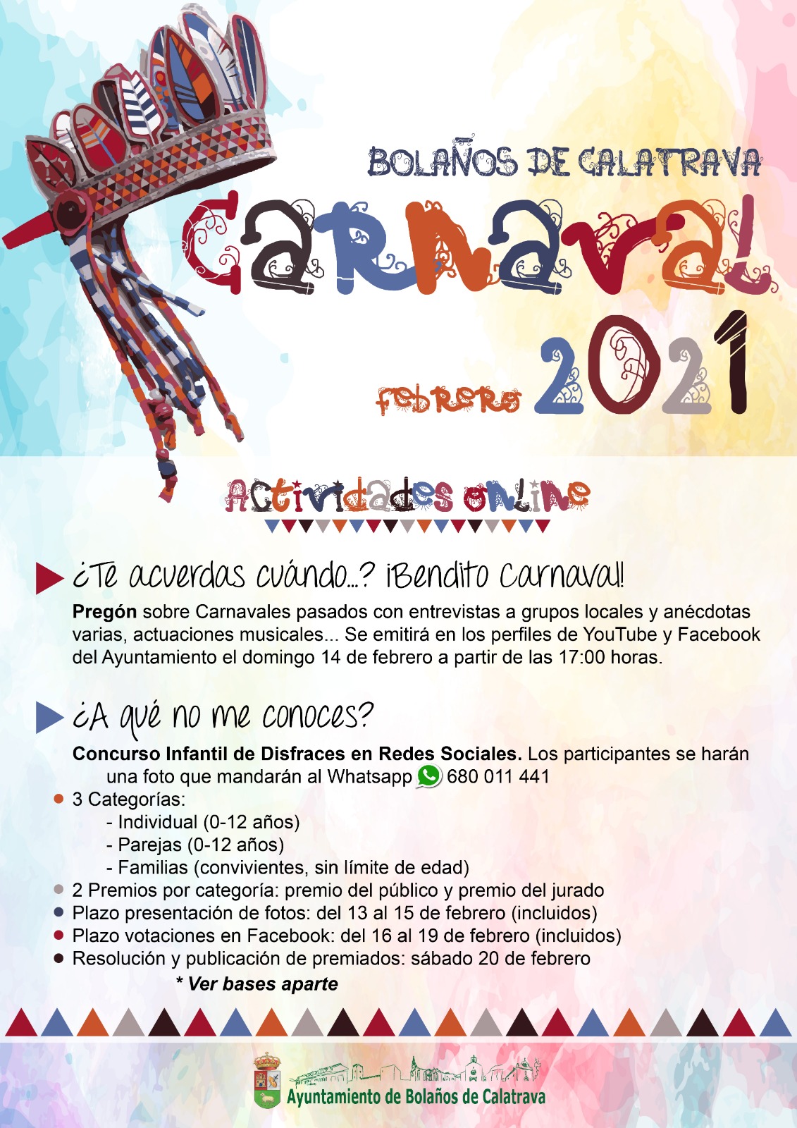 Para ello se ha programado un 'Pregón Virtual' sobre carnavales pasados con entrevistas a grupos locales y anécdotas varias, actuaciones musicales etc, que se emitirá en los perfiles de Youtube y Facebook del Ayuntamiento, el próximo 14 de febrero a partir de las 17:00 horas.