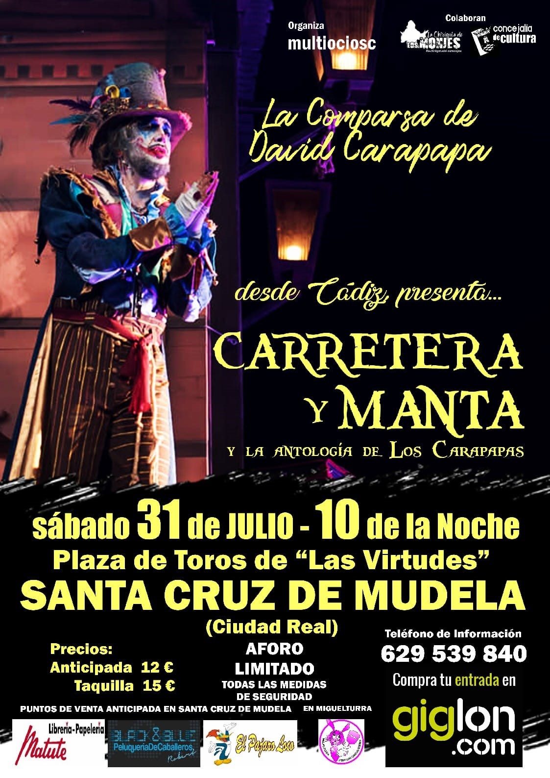 La comparsa de Cádiz, “Carretera y Manta”, dirigida por David Sánchez Mateos, actuará el sábado 31 de julio, a las 22:00 horas, en la Plaza de Toros – Santuario de Las Virtudes en Santa Cruz de Mudela, con su nuevo repertorio, y con una “Antología de los Carapapas”, que está siendo un éxito de público y de espectáculo, allá por donde está representando. Se trata de la primera vez que esta agrupación del Carnaval de Cádiz, visita esta localidad.