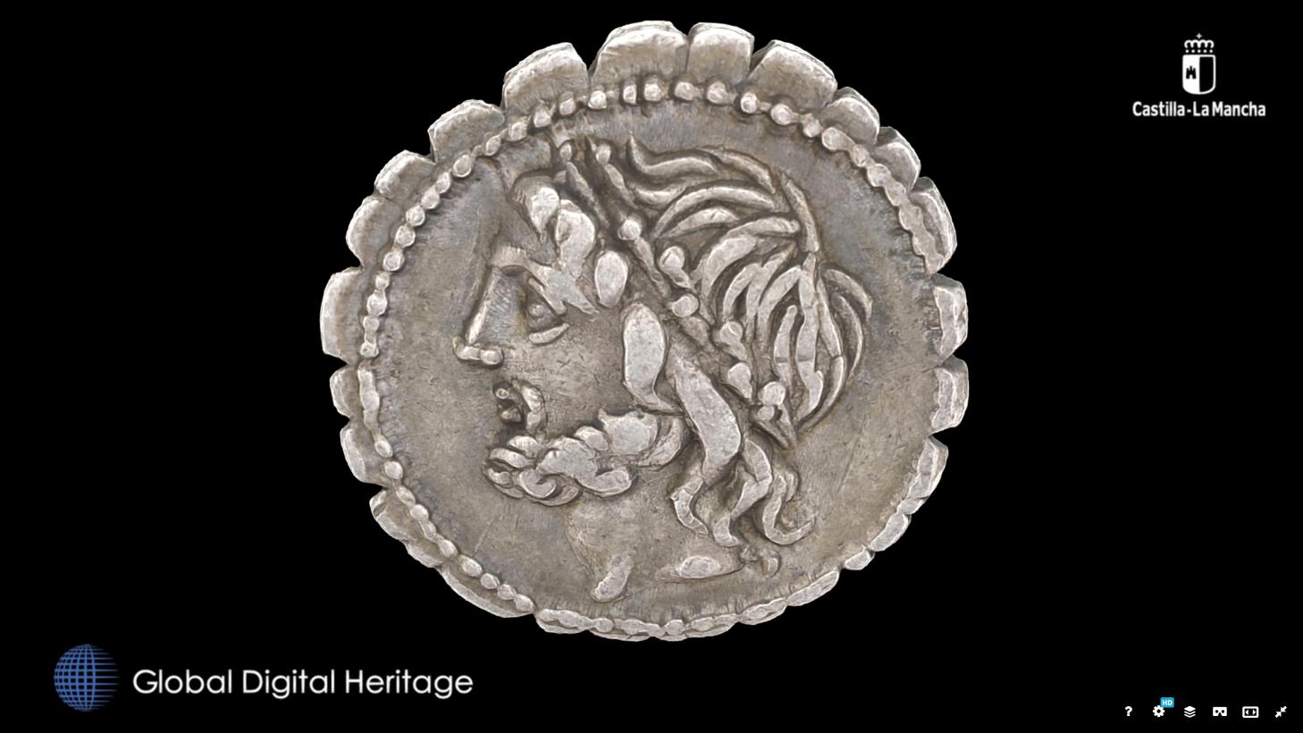 Por lo que se refiere a la moneda romana es de plata y fue encontrada en la Finca Las Navas de Almadenejos. En una de las caras se puede ver la cabeza de Júpiter y en la otra cara a Júpiter en una cuadriga. Puede verse en el siguiente enlace: https://sketchfab.com/nebulousflynn/collections/cultural-heritage-and-history-top-10-2020-wk-51