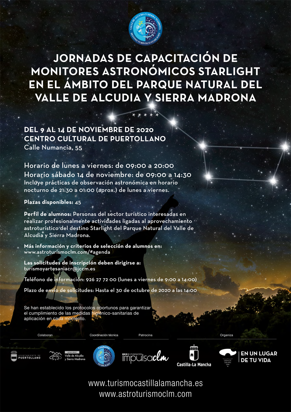 Esta acción formativa se dirige preferentemente a personas procedentes de empresas y profesionales del sector turístico, en especial para los del área del parque natural, e interesados en realizar profesionalmente actividades ligadas al aprovechamiento astroturístico del destino Starlight. Se impartirá en el Centro Cultural de Puertollano y en localizaciones del parque natural en las que se realizarán prácticas de observación en horario nocturno. El curso se desarrolla bajo la coordinación técnica de la Fundación Starlight en modo presencial y cuenta con la colaboración del Parque Natural Valle de Alcudia y Sierra Madrona y sus municipios, así como del Ayuntamiento de Puertollano. Se establecerán los protocolos oportunos para garantizar el cumplimiento de las medidas higiénico-sanitarias de aplicación en cada momento.