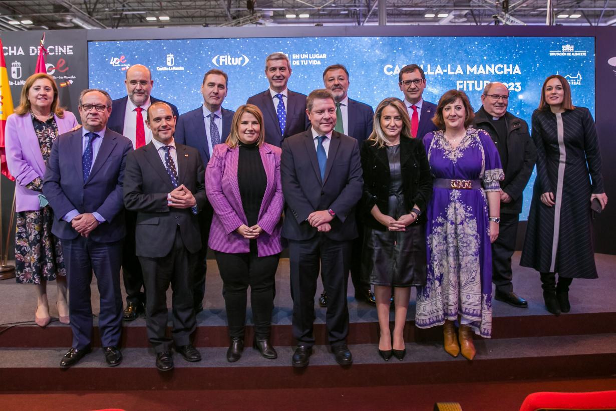 El presidente regional ha inaugurado el estand de Castilla-La Mancha en FITUR 2023, más de 1.500 metros cuadrados de espacio que tienen como leitmotiv el mundo del cine, iluminados con unas llamativas luces de neón que además asemejan a un espacio de cine, con decorados, salas de proyección de cada una de las provincias y butacas originales de cine en un escenario principal que ha acogido el acto de inauguración, después de que los Reyes de España hayan visitado el espacio castellanomanchego en la apertura de la feria.