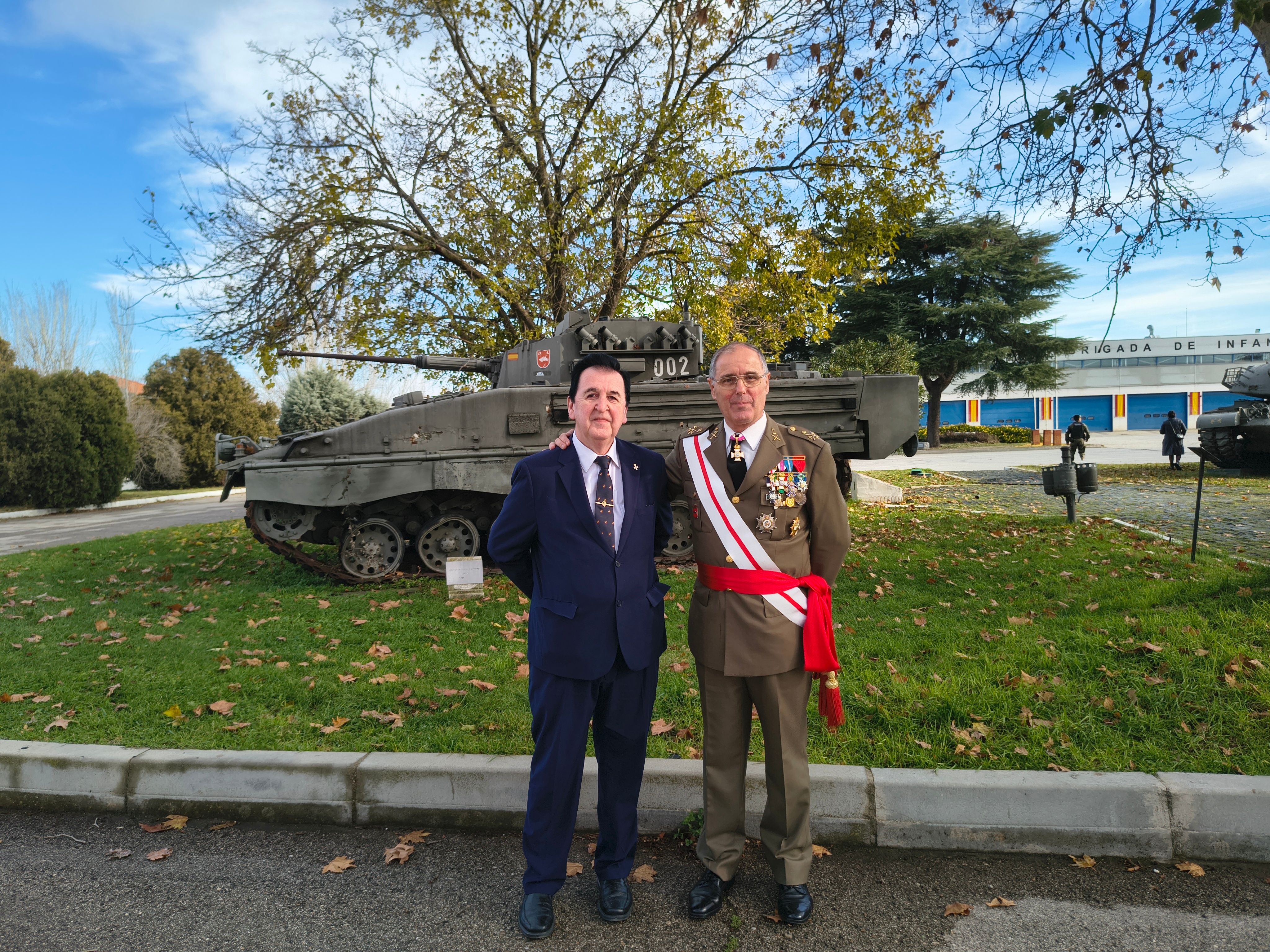 La jornada sirvió para el reencuentro con anteriores mandos que ostentaron diversos empleos en la citada Gran Unidad, caso del Teniente General Palacios, encargado de hacer el brindis por el Rey, que aparece en la foto de Roberto Muñoz, junto al Embajador “Marca Ejército”, Ángel López, delante de un carro de combate “Pizarro”.