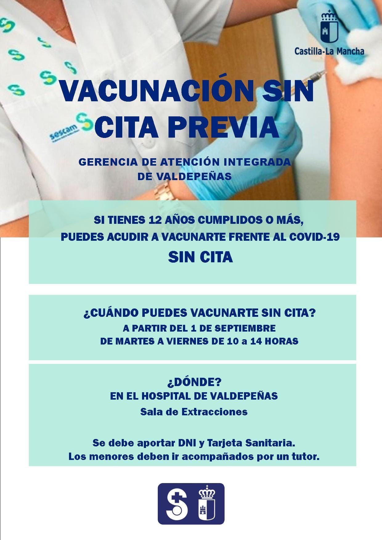La Gerencia de Atención Integrada de Valdepeñas vacunará sin cita previa a toda aquella persona de 12 o más años que se presente en la sala de extracciones del Hospital de la Ciudad del Vino a partir del miércoles 1 de septiembre. Esta vez no es ningún bulo. El Gobierno de Castilla-La Mancha ya tiene el cartel con el que pide a los ciudadanos que lo hagan.