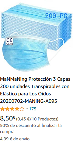 En plataformas como Amazon, se puede ver la variación de precios en este tipo de mascarillas y es que se llegan a vender en packs de 200 unidades a un precio total de 8,50, es decir, a menos de cinco céntimos la unidad (sin contar gastos de envío).