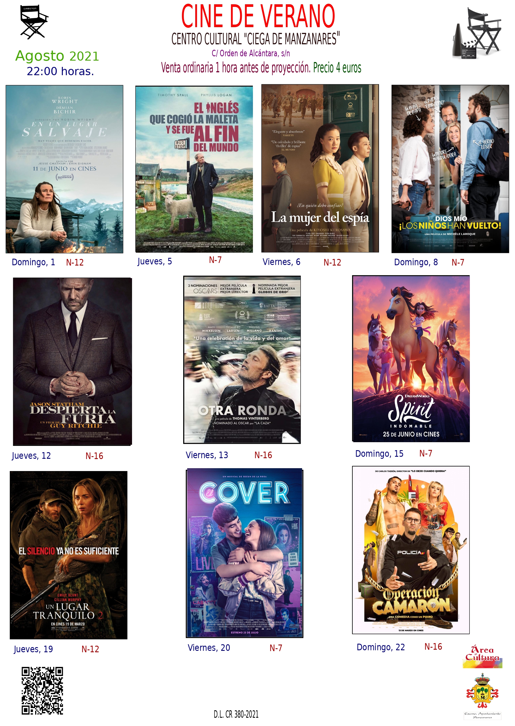 Como viene siendo habitual, el área de Cultura ha elaborado un código QR que estará disponible en diferentes puntos, para escanearlo y poder consultar en el teléfono móvil toda la información de la cartelera de verano, Las entradas podrán adquirirse en el centro 'Ciega de Manzanares' desde una hora antes de que de comienzo la proyección, que será todos los días a las 10 de la noche.