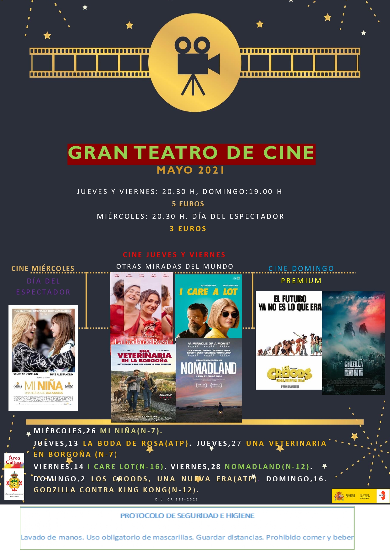 El ciclo de cine para el mes de mayo se cerrará con alguna sorpresa: el miércoles 26 el Gran Teatro celebra el día del espectador. Por tan sólo 3 euros el público podrá disfrutar de la película francesa 'Mi niña', en una sesión que dará comienzo a las 20:30 horas. Le sigue otro título de nacionalidad gala, el jueves 27, 'Una veterinaria en la Borgoña', también a las 20:30 horas. Finalmente, el viernes 28 de mayo, a la misma hora, llega la oscarizada 'Nomadland', ganadora de los premios de la Academia a: 'Mejor Película', 'Dirección' y 'Actriz'.