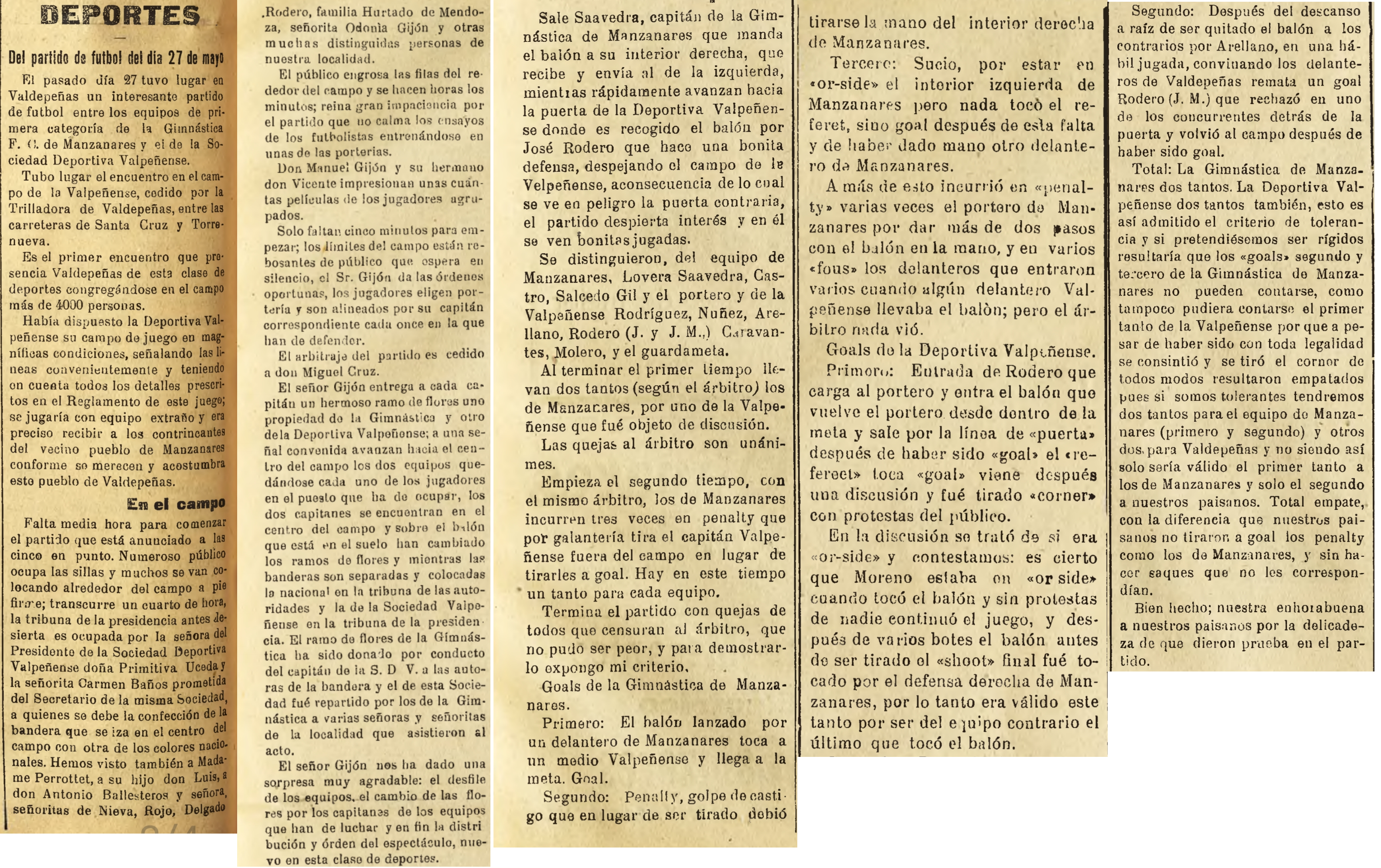 Don Manuel Gijón, presidente de la Sociedad Deportiva Valpeñense, hizo las veces de árbitro del encuentro así como de fotógrafo junto a su hermano Vicente, por lo que imagino que pudiese haber fotos de este partido que no he encontrado. Los penaltis que se cobró el equipo local se lanzaron fuera a modo de “galantería” y otras cosas como la omnipresente polémica arbitral hacen de esta crónica todo un espectáculo.