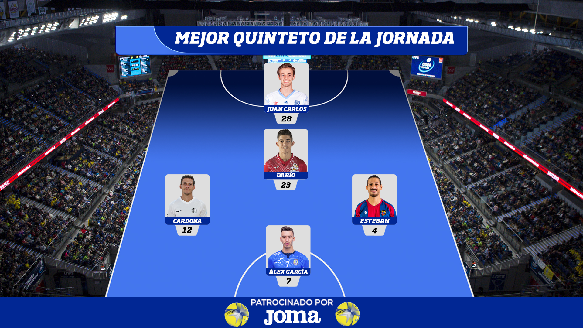 La Jornada 26 de la máxima categoría del Fútbol Sala nacional ha estado repleta de grandes actuaciones individuales sobre las que destacan cinco. En la portería se encuentra Juan Carlos (BeSoccer UMA Antequera), en el cierre a Darío (ElPozo Murcia Costa Cálida), en las alas Cardona (Industrias Santa Coloma) y Esteban (Levante UD) y en el pívot, Álex García (Viña Albali Valdepeñas).