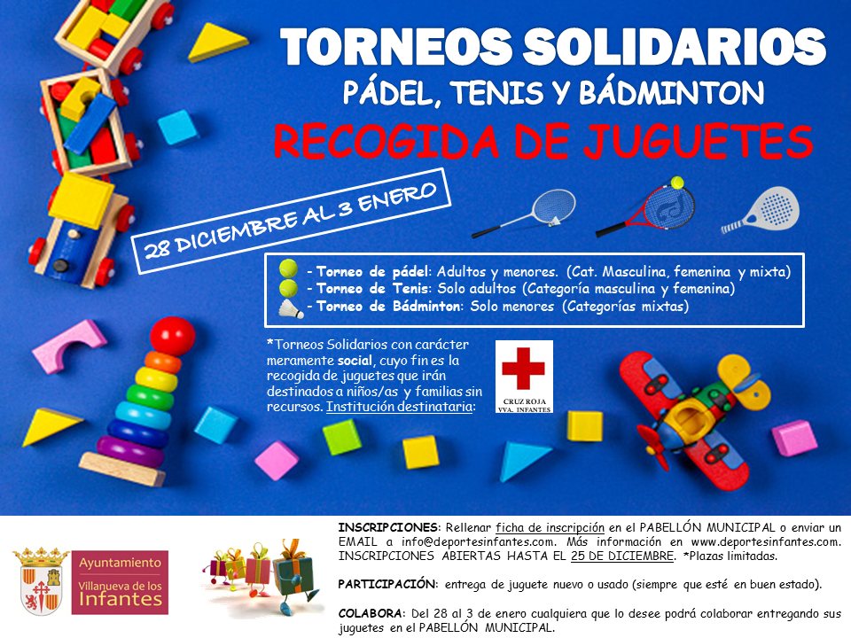 Del 28 de diciembre al 3 de enero se celebrarán, en las Instalaciones Deportivas Municipales de Villanueva de los Infantes, distintos eventos solidarios cuyo fin será la recogida de juguetes, que irán destinados a niños, niñas y familias sin recursos, a través de Cruz Roja Villanueva de los Infantes.