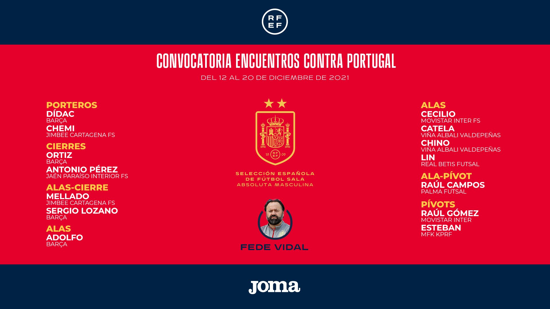 Fede Vidal ha dado esta mañana la lista de convocados para los amistosos contra la flamante campeona del mundo, Portugal, que se celebrarán los días 18 y 19 de diciembre. Una lista en la que hay dos jugadores vinateros, Catela y Chino. El primero está entre los elegidos por segunda vez consecutiva y el albaceteño vuelve a una convocatoria después del Mundial de Lituania.