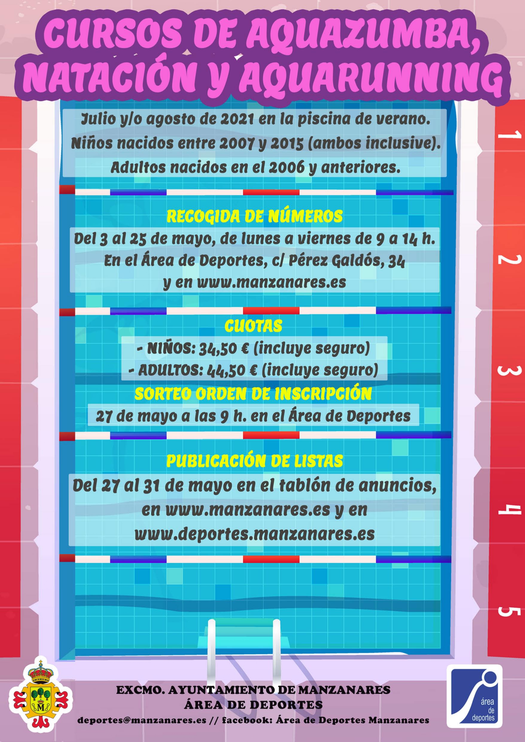 Las personas interesadas en participar en estas actividades acuáticas deben recoger su número en el Área de Deportes (calle Pérez Galdós, 34) o en la página web del Ayuntamiento https://www.manzanares.es/sorteo-plazas-para-cursos-piscina-verano antes del 25 de mayo. El jueves 27 de mayo se efectuará el sorteo del orden de inscripción y del 27 al 31 de mayo se publicarán las listas. La cuota de inscripción a los cursos para los menores es de 34'50 euros y de 44'50 euros para los adultos (ambas incluyen seguro deportivo).