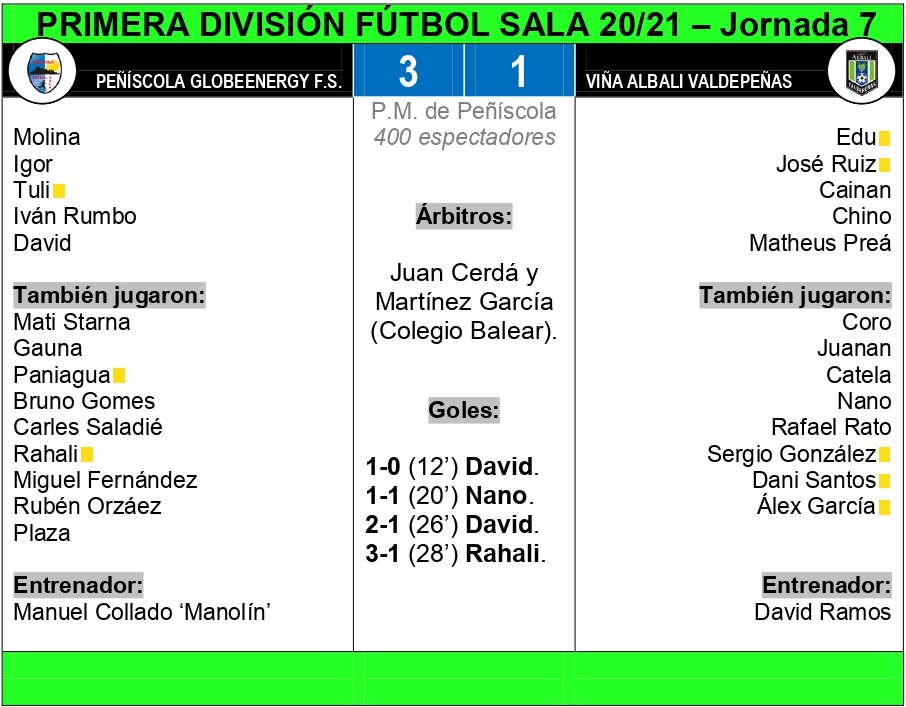 El Pabellón Municipal de Peñíscola acogía el duelo de la 7ª jornada entre el equipo local, el Peñíscola Globeenergy F.S. y el Viña Albali Valdepeñas. Los de la Ciudad del Vino se presentaban en tierras castellonenses para disputar su quinto partido liguero de la temporada.