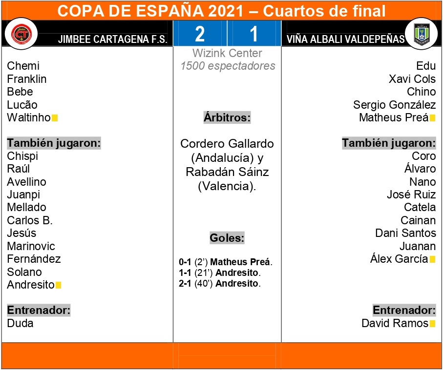 El Viña Albali Valdepeñas se medía a Jimbee Cartagena en los cuartos de final de la Copa de España 2021. Los azulones se presentaban en el Wizink Center de Madrid con la intención de lograr una gesta similar a la del pasado año en Málaga.