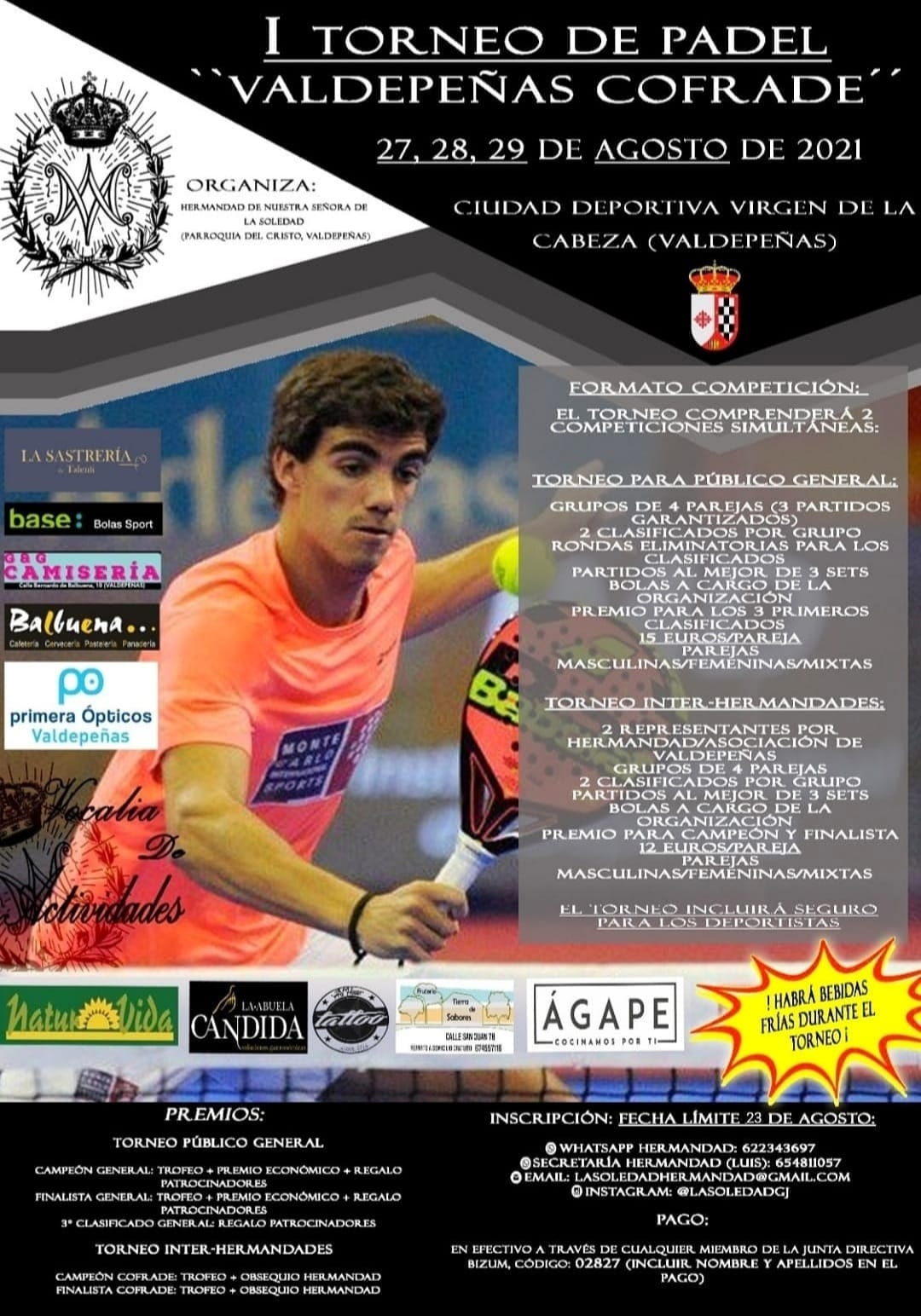 La Hermandad de Nuestra Señora de la Soledad ha organizado el I Torneo de Pádel 'Valdepeñas Cofrade' que tendrá lugar en las instalaciones de la Ciudad Deportiva Virgen de la Cabeza durante los días 27, 28 y 29 de agosto. Las pistas han sido cedidas por el Ayuntamiento de la localidad.