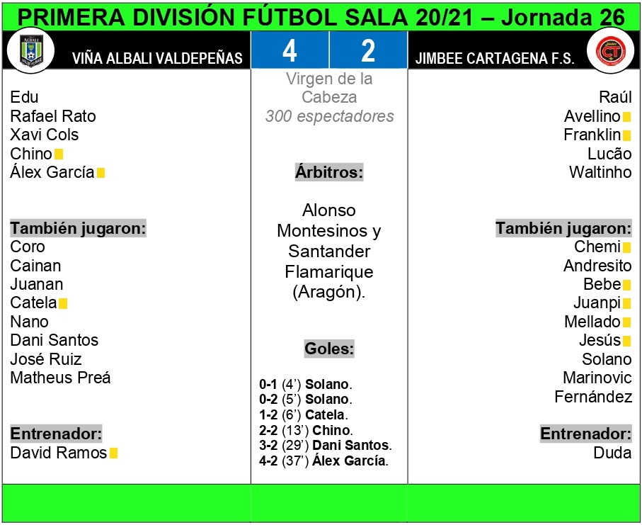 En el minuto 37, Álex García se encargaba de hacer el 4-2 después de un córner. Jimbee Cartagena lo intentaba de juego de cinco, pero el Viña Albali Valdepeñas se defendía bien.