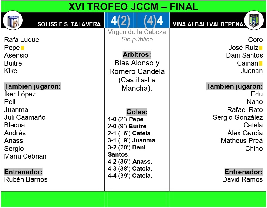 El Viña Albali Valdepeñas venció en la final del XVI Trofeo JCCM frente al Soliss F.S. Talavera. El conjunto valdepeñero fue por debajo en el marcador casi todo el encuentro. El juego de cinco le sirvió para empatar en los compases finales y acabar imponiéndose en la tanda de penaltis.