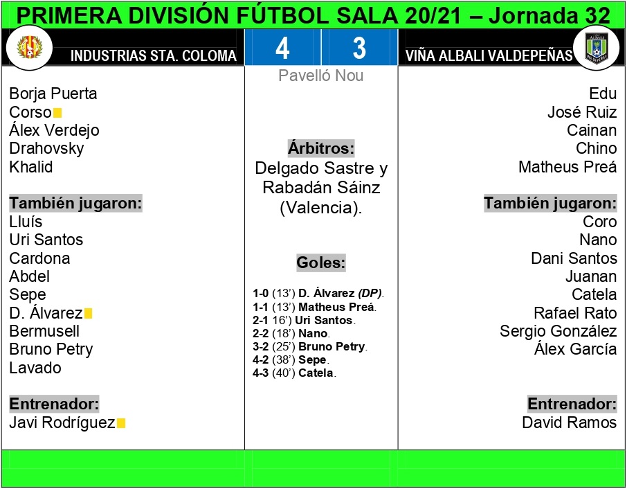El Viña Albali Valdepeñas se medía a domicilio a Industrias Santa Coloma, en partido correspondiente a la 32ª jornada de la Primera División de Fútbol Sala. El Pavelló Nou acogía el choque de la tarde del miércoles entre colomenses y valdepeñeros.