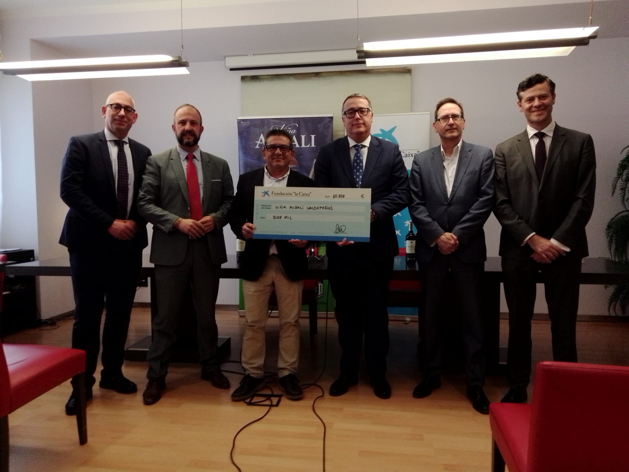 En la firma y presentación del convenio estuvieron el presidente del Viña Albali Valdepeñas, Luis Palencia, y el director comercial de la Fundación La Caixa, Antonio Matallanos, junto a otros representantes de la entidad bancaria.