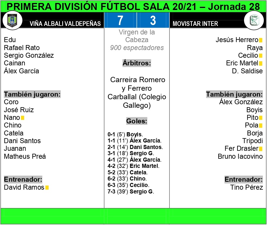 Victoria con partidazo del Viña Albali Valdepeñas ante Movistar Inter en el Virgen de la Cabeza (7-3). Boyis adelantaba a los visitantes. Álex García (2), Dani Santos y Sergio González daban la vuelta al marcador. Eric Martel recortaba distancias, pero Catela y Chino otorgaban más ventaja a los locales. Cecilio marcaba el tercer tanto interista y Sergio González, en el último minuto, sellaba el triunfo azulón.