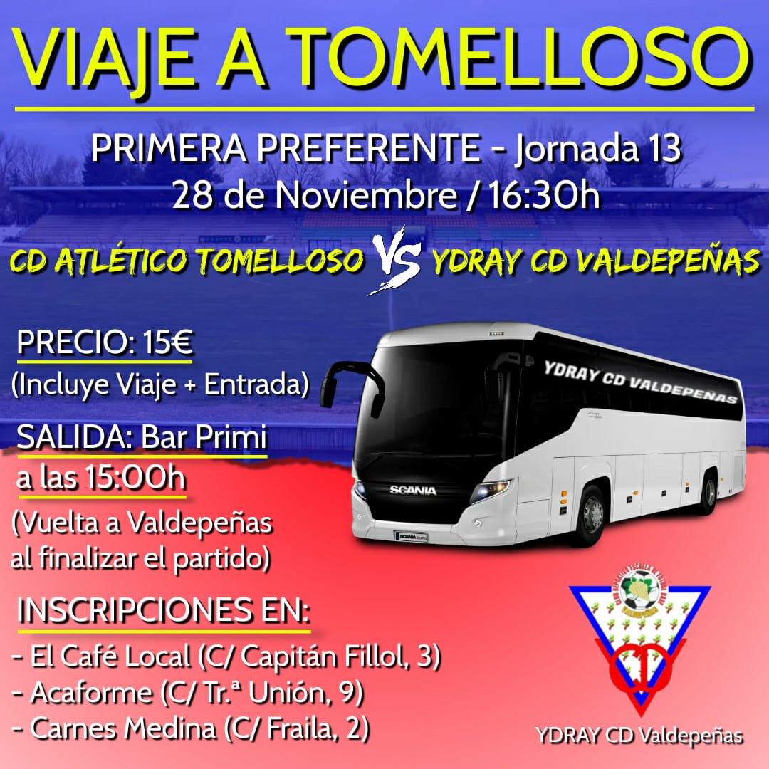 El Ydray CD Valdepeñas organiza un viaje a Tomelloso para que los aficionados que quieran ir a ver y a animar al equipo en el partido de este fin de semana frente al Atlético Tomelloso puedan hacerlo en el campo. El encuentro tendrá lugar el próximo domingo a las 16:30 horas.