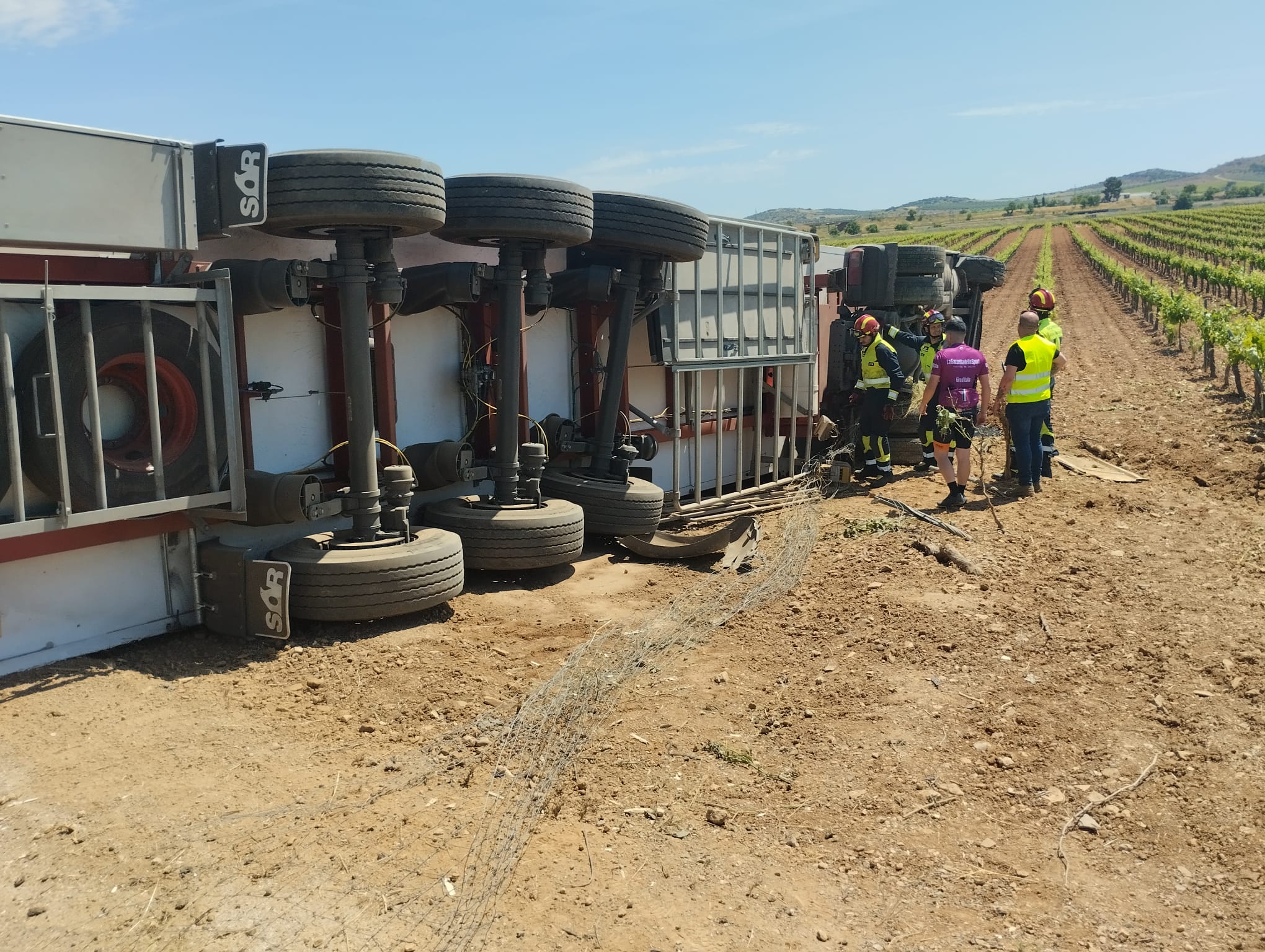 Un camión articulado se ha salido de la vía este mediodía, cuando circulaba por la Autovía A4 en sentido norte a la altura del kilómetro 208, en el término de Valdepeñas. Todo indicaba que el reventón de una rueda delantera ha sido la causa de la salida. El vehículo transportaba bananas o plátanos y ha quedado volcado en una viña. Su conductor, un hombre de 64 años ha sufrido heridas leves. Fuentes sanitarias indicaban en el lugar, que se disponían a trasladarlo al Hospital de Valdepeñas para ser reconocido.