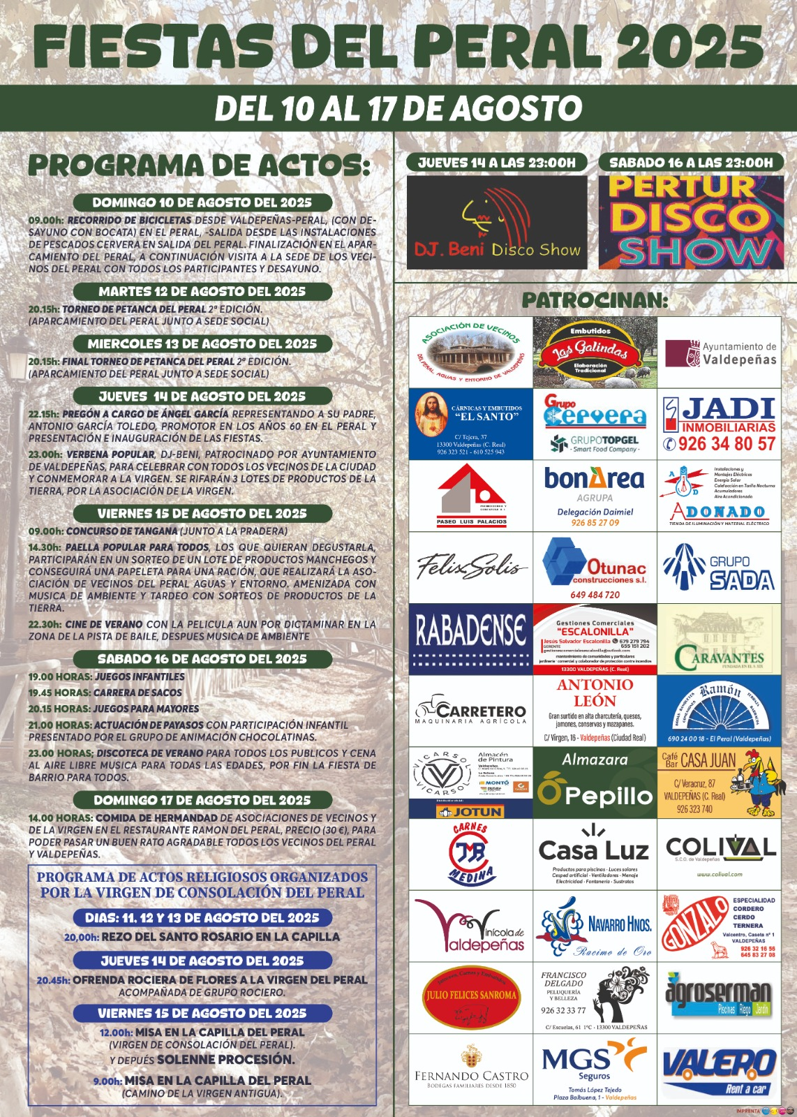 La asociación de vecinos del Peral, Aguas y Entorno celebrará del 10 al 17 de agosto sus ya tradicionales fiestas en honor a la Virgen de Consolación del Peral. Fiestas que cuentan con novedades como las actividades infantiles del día 16 de agosto a partir de las 19:00 horas y una discoteca de verano esa misma noche.