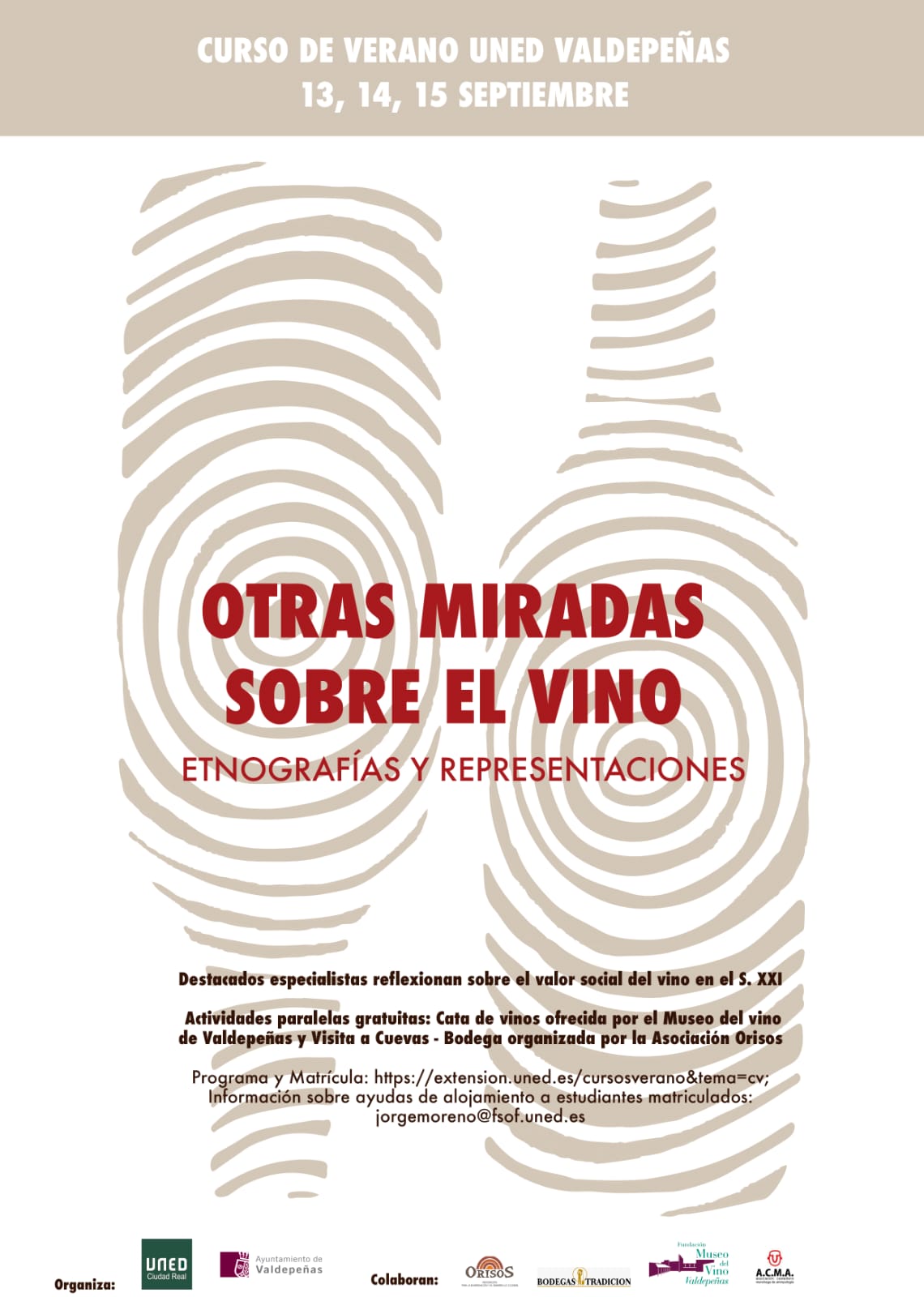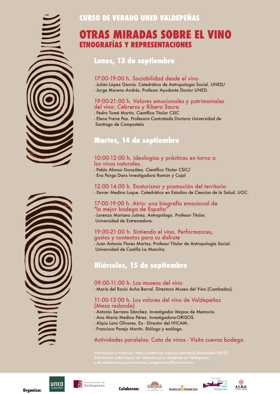 El curso, que se va a desarrollar del 13 al 15 de septiembre de 2021, consta de 20 horas lectivas y 1 crédito ECTS, se ofrece tanto en modalidad presencial como en las modalidades on line en directo o en diferido y está dirigido a estudiantes y profesionales de los campos de humanidades y ciencias sociales pero también a interesados en las culturas del vino.