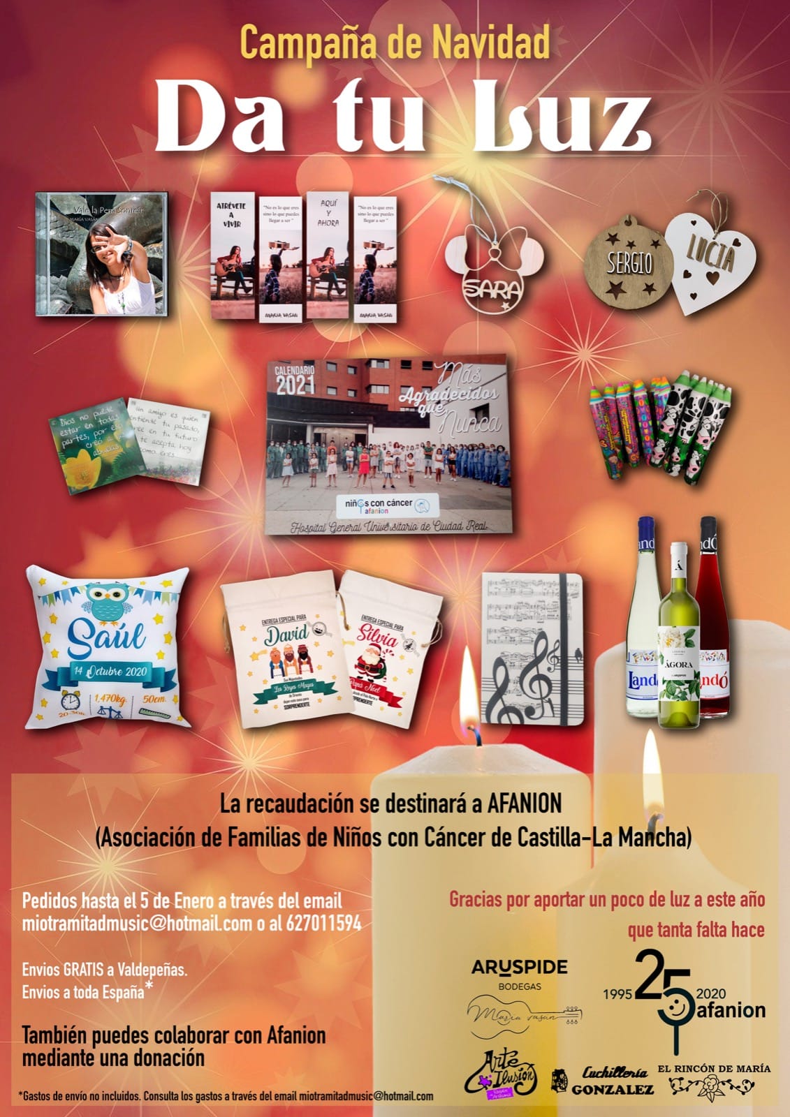 La cantante valdepeñera, María Vasán, ha puesto en marcha una campaña destinada a la recaudación de fondos para Afanion y en apoyo al pequeño comercio de Valdepeñas en esta etapa tan dura. La campaña llega por Navidad bajo el nombre de 'Da tu luz' y estará abierta hasta el 5 de enero de 2021.