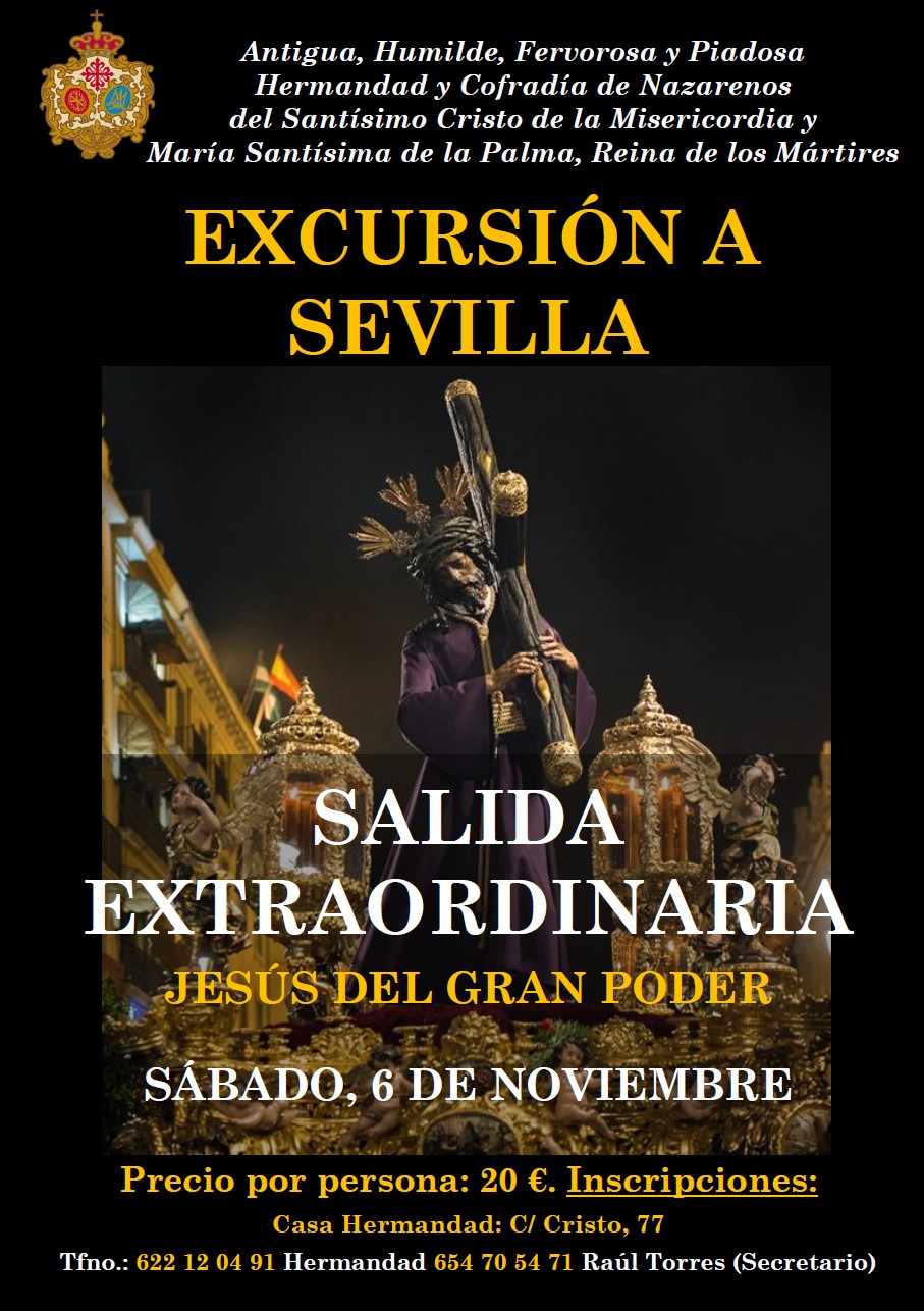 La Hermandad de Misericordia y Palma organiza una excursión a Sevilla, el sábado 6 de noviembre, con motivo de la Salida Extraordinaria del Padre Jesús del Gran Poder, de regreso a su Basílica tras la finalización de su Santa Misión Evangelizadora que realizará en tres parroquias de la periferia de la ciudad de Sevilla.