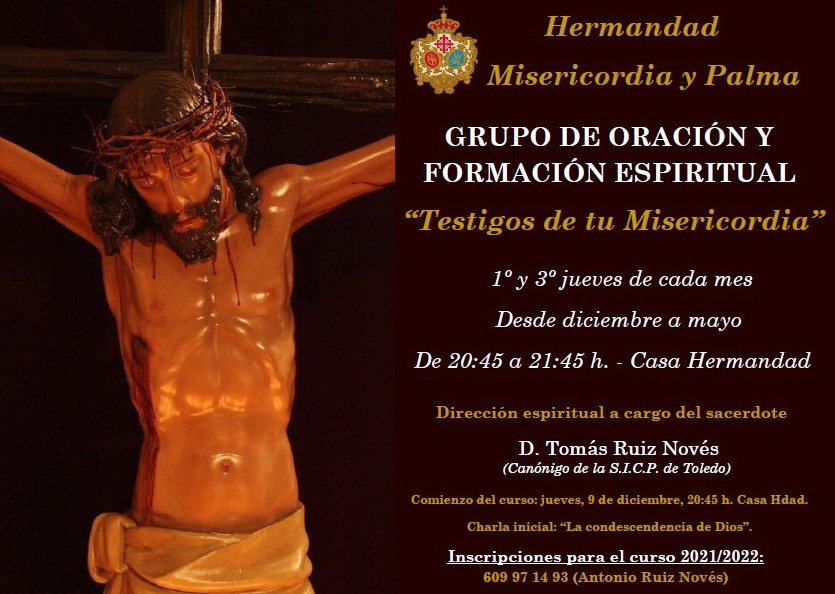 La Vocalía de Cultos y Formación de la Hermandad de Misericordia y Palma retoma la actividad del grupo de oración y formación espiritual, dirigido a hermanos y aspirantes a hermanos de la Hermandad, con el que se pretende profundizar en la vivencia de la fe y en las enseñanzas de Jesús. Una iniciativa que surgió en el año 2019/20 bajo la denominación de 'Testigos de tu Misericordia'.