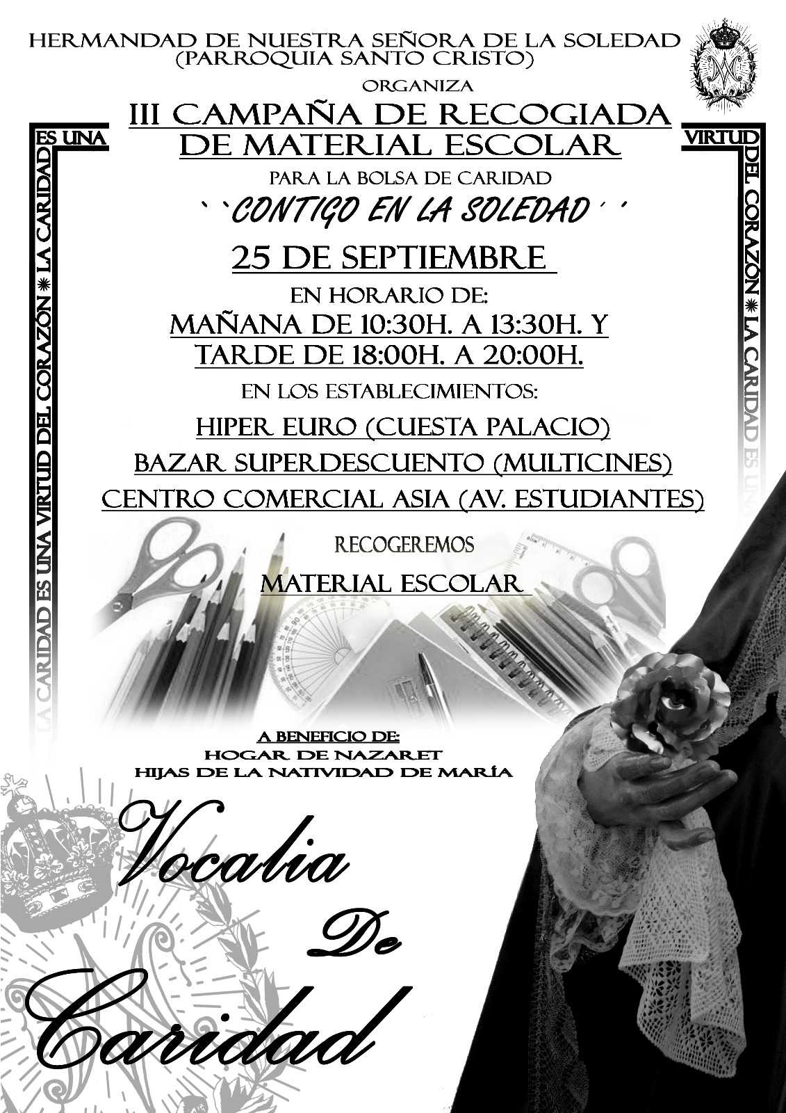 La vocalía de Caridad de la Hermandad de Nuestra Señora de la Soledad de la Parroquia del Cristo, organiza para este sábado su III Campaña de Recogida de Material Escolar a beneficio de la bolsa de Caridad de la Hermandad “Contigo en la Soledad”.