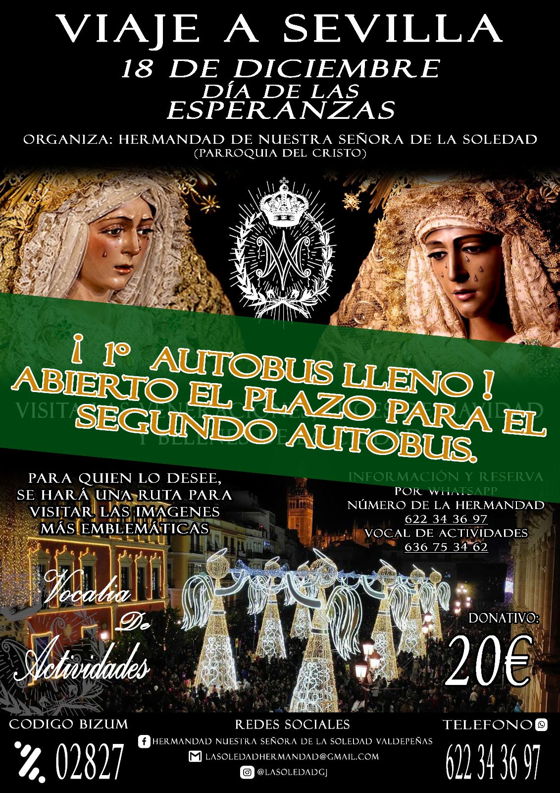 La Hermandad de Nuestra Señora de la Soledad de la Parroquia del Cristo ha decidido, tras agotarse las plazas del bus que tenía previsto para el viaje a Sevilla el próximo día 18 de diciembre para disfrutar del día de las Esperanzas, luces de navidad, mercadillos navideños y demás atractivos que presenta la capital hispalense en Navidad, informa a todos los interesados que ya se están reservando las plazas para un segundo autobús que se pondrá a disposición de todos los interesados en disfrutar de esta jornada en Sevilla.