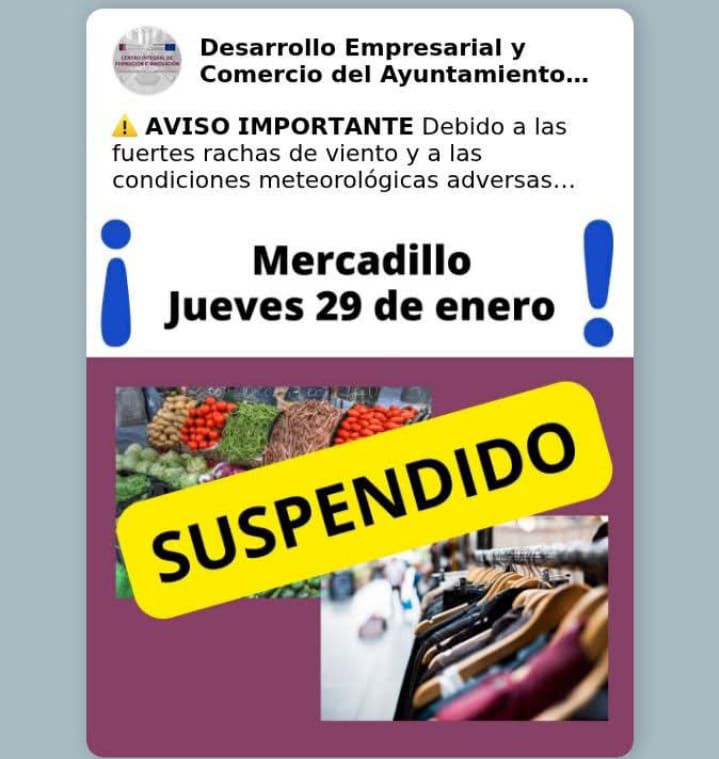 Suspendido en Valdepeñas el mercadillo de mañana jueves, por el temporal de viento