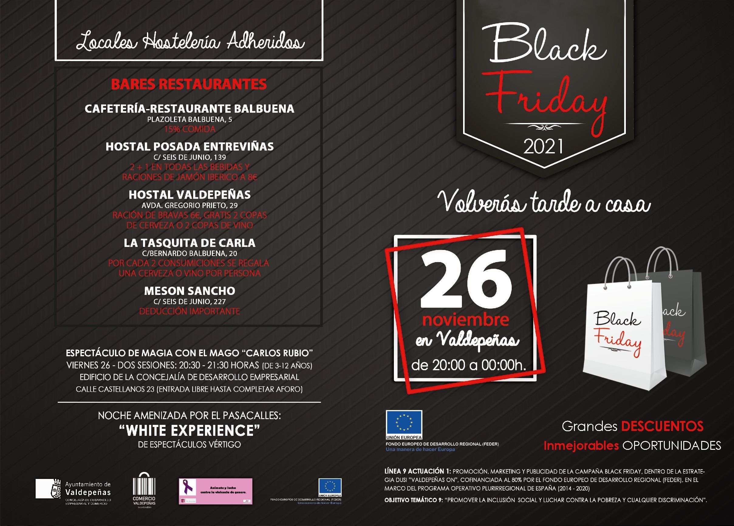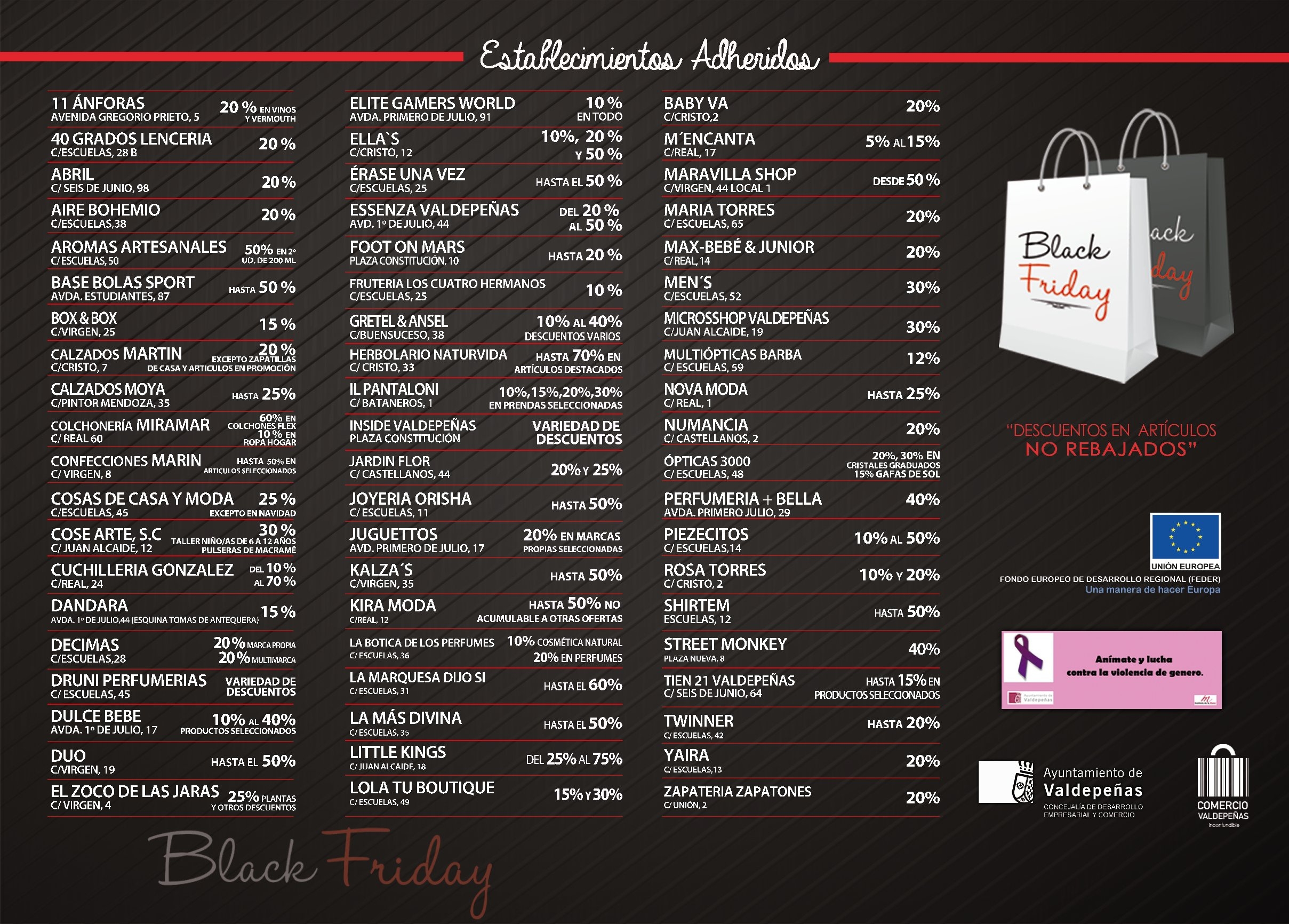 Valdepeñas alargará este viernes, 26 de noviembre, de 20.00 a 00.00 horas, el 'Black Friday' con 65 establecimientos participantes, que ofrecerán sus artículos de moda, electrodomésticos, juguetes, material deportivo, informática, óptica o perfumería, entre otros, con grandes descuentos de hasta el 70%, y se sumarán además este año un espectáculo pasacalle y decoración en los establecimientos adheridos.