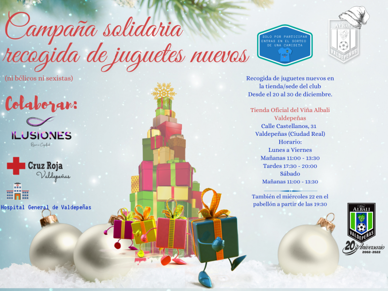 El Viña Albali Valdepeñas ha informado que va a llevar a cabo una campaña solidaria de recogida de juguetes nuevos en colaboración con la Asociación Ilusiones Rosario Cogolludo en su proyecto “Ningún niño sin juguete”.