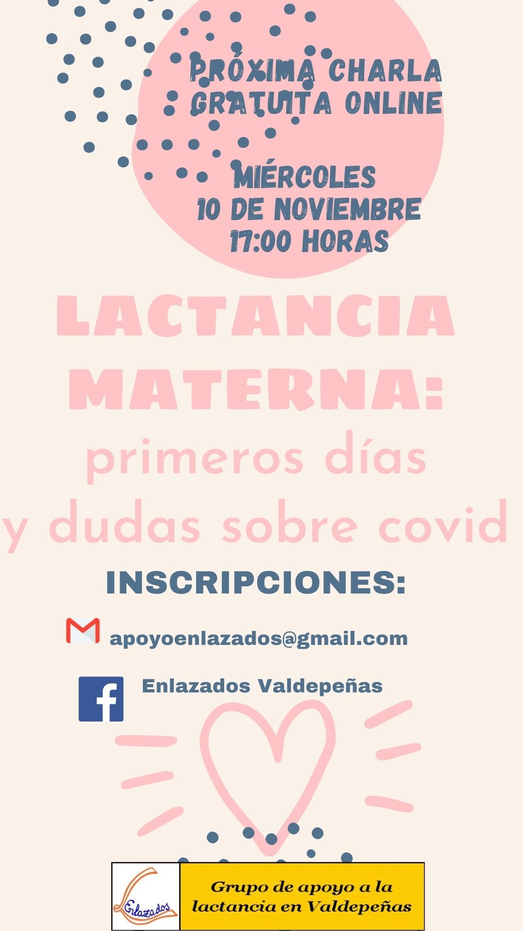 Entretanto, la actividad que continúa y no ha cesado en ningún momento es la del acompañamiento y asesoramiento personalizado a las mujeres lactantes en cualquier duda o consulta que quieran realizar al grupo a través de correo electrónico, Facebook o teléfonos disponibles, que se atenderán por cualquiera de estos medios o concertando un encuentro personal. Enlazados invita a que se pueda contar con ellos en este apasionante camino de la lactancia y crianza.